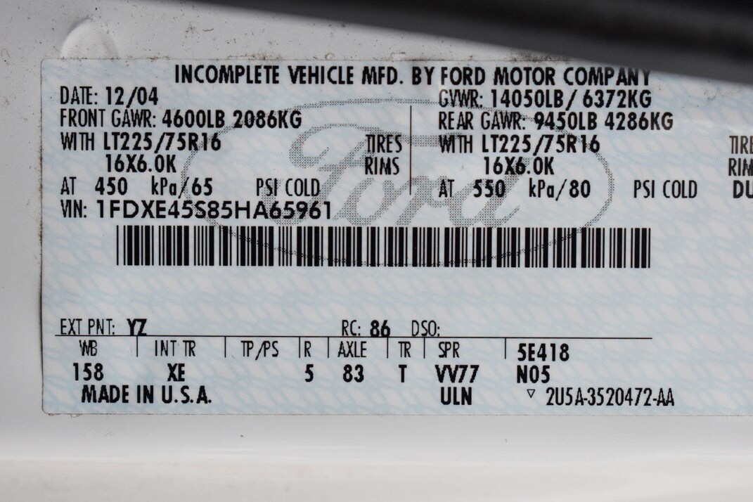 | Miles: 38,880 | | Stock Number: 14189G | | VIN: 1FDXE45S85HA65961 | | Fuel Type: Gasoline | | Cylinders: 6.8 L | | Engine Desc: V-10 cyl |