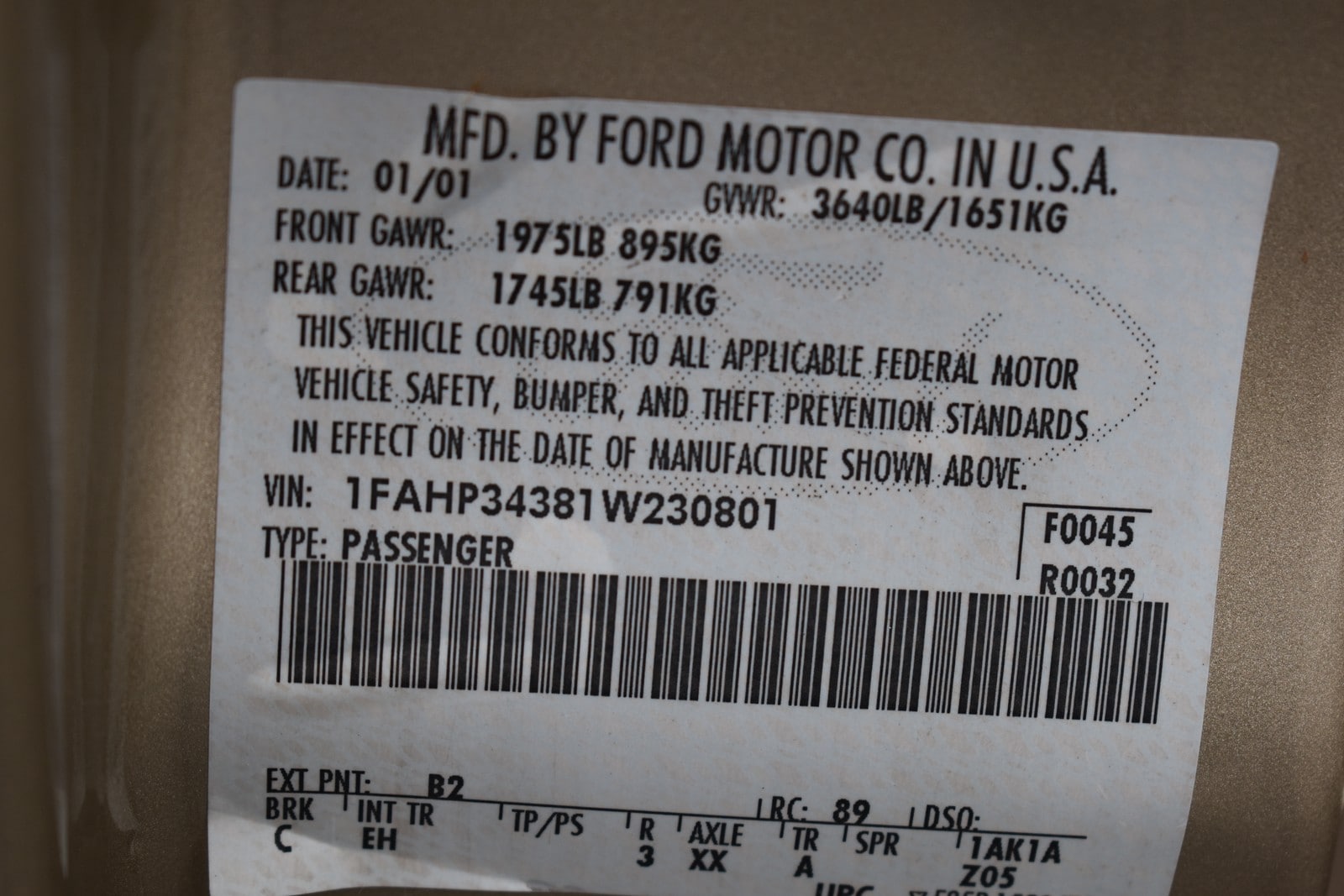 | Miles: 61,604 | | Stock Number: 14129AG | | VIN: 1FAHP34381W230801 | | Fuel Type: Gasoline | | Cylinders: 2 L | | Engine Desc: I4 F DOHC / Front wheel drive |